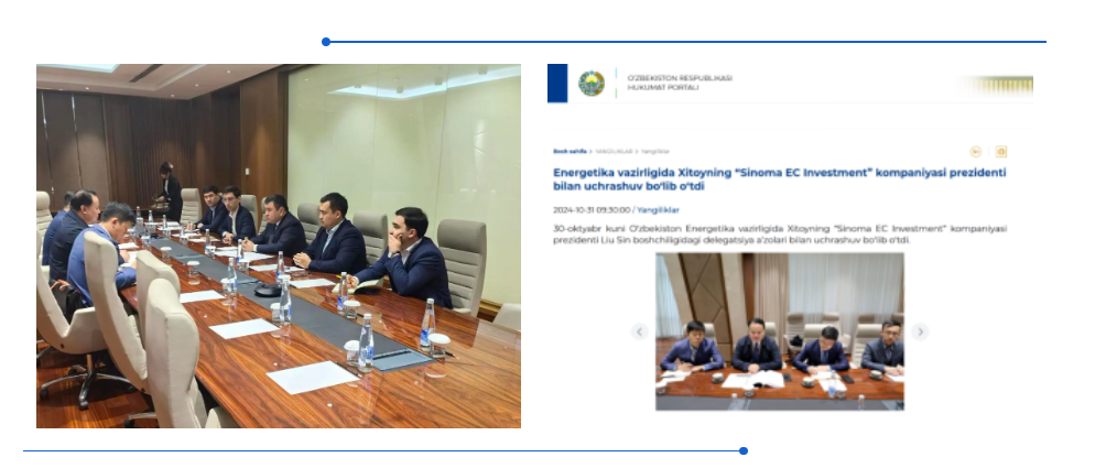 This visit to Uzbekistan will effectively promote the international business development of Sinoma Energy Conservation, laying a solid foundation for further expanding into the Uzbekistan and Central Asian markets. It also creates favorable conditions for the smooth implementation of the Navoi Green Energy Low Carbon Project, highlighting Sinoma Energy Conservation's advantages and professional strength in the field of integrated energy management and utilization, and contributing to the group's vision to "create a new Chinese building material overseas".